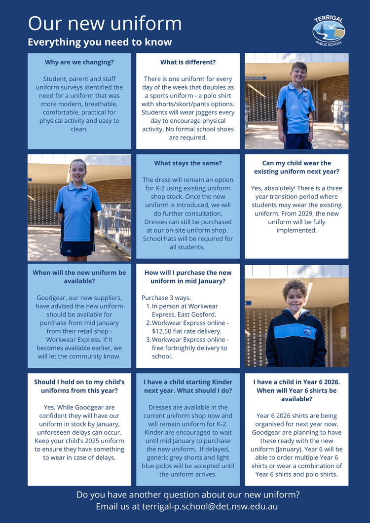 Terrigal Public School is in the process of introducing a new school uniform for 2026. Our new uniform will be available for purchase from January 2026 through Workwear Express East Gosford - in store or online. There is a three year transition period to our new uniform. During this time, students may wear the new uniform or the 2025 uniform.